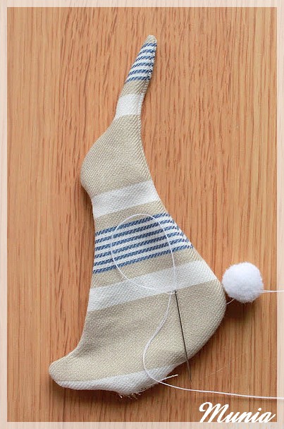 Teraz część dekoracyjna... Przewracam zajączka na prawą stronę i przyszywam ogonek. Wypycham całość watoliną począwszy od uszu. Zszywam ręcznie dół.