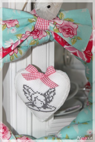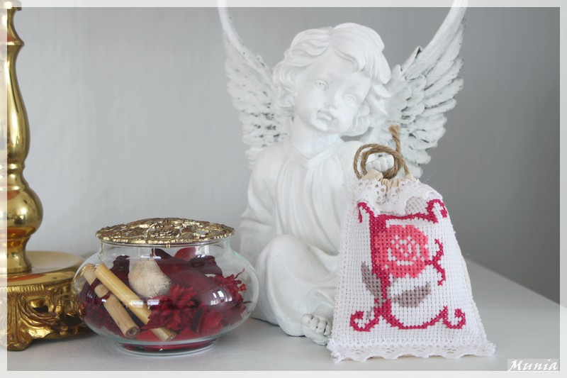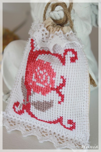 Obowiązkowo musiał się znaleźć ptaszek i aniołek, mój ulubiony motyw przewodni w dekoracjach :) Troszeczkę mam za twardą kanwę i przez co deformuje mi się kształt serduszka. Próbowałam na innej o większych oczkach i bardziej miękkiej i okazało się, że nie spełnia moich oczekiwań... serduszko wyglądało po prostu nieestetycznie, więc je rozprułam, i wyszyty monogram z pierwszą literą mojego imienia znalazł inne zastosowanie...praktyczno-ozdobne. Uszyłam płócienny woreczek na cokolwiek:) a przód właśnie ozdobiłam kanwą z haftem:
