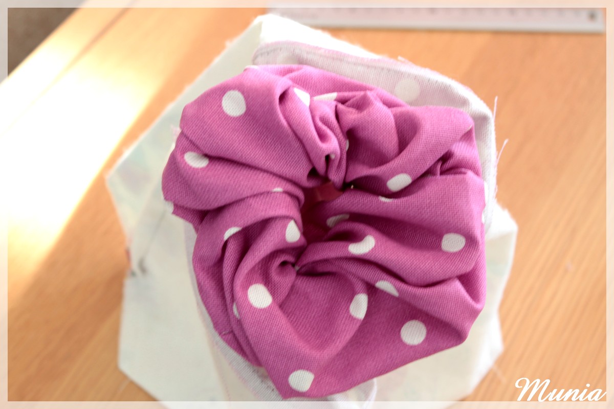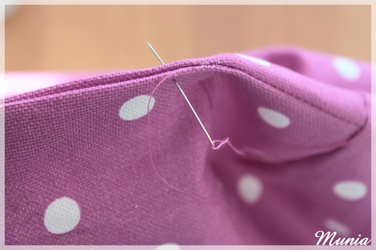 - materiał na wewnętrzną część ( u mnie fioletowy w białe grochy )