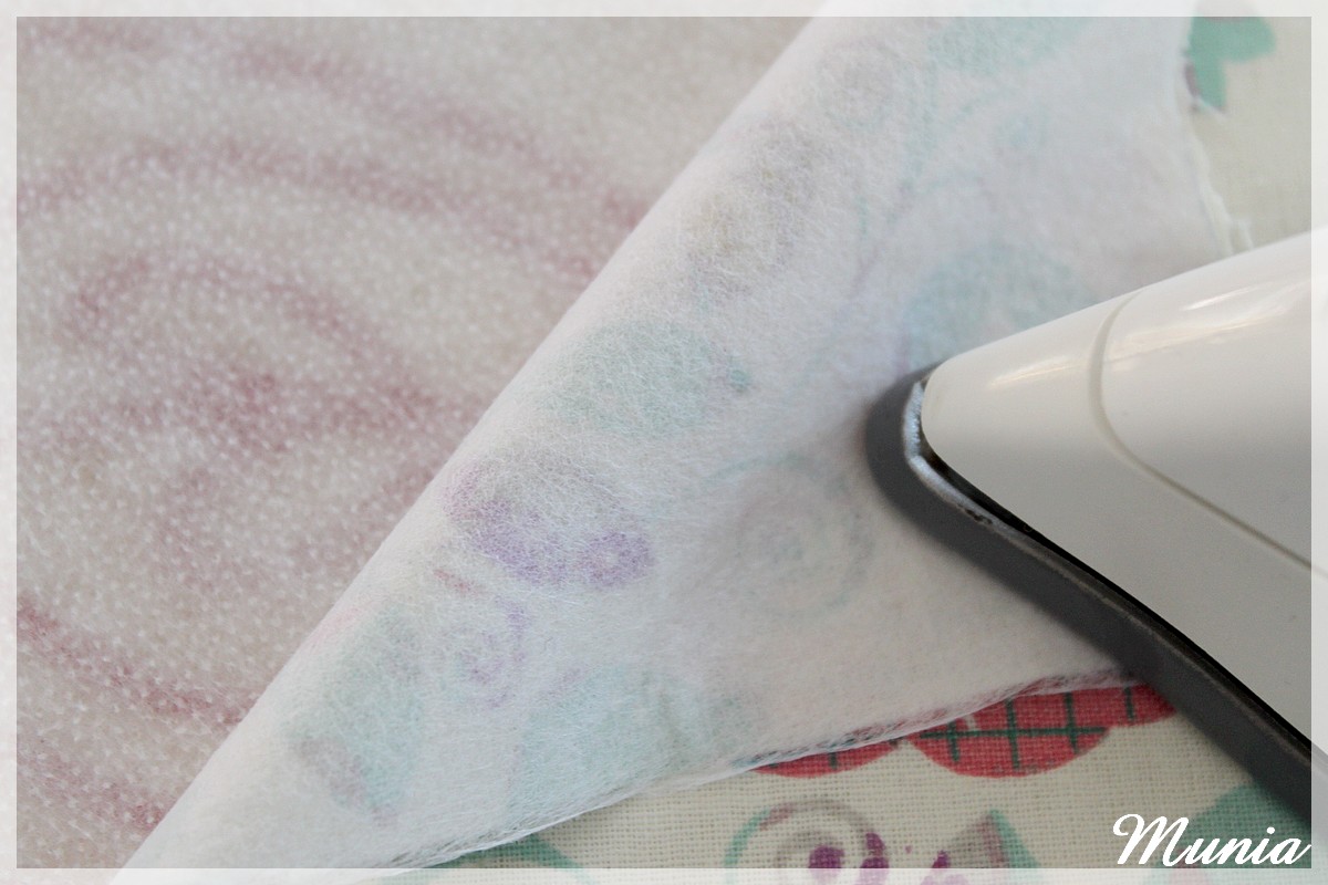 3. W pierwszej kolejności postępując zgodnie z zalecaniami producentami, przyklejam flizelinę z usztywniaczem za pomocą żelazka bez pary na lewej stronie materiału, który wybrałam na wierzch mojego koszyka ( materiał w ptaki ).