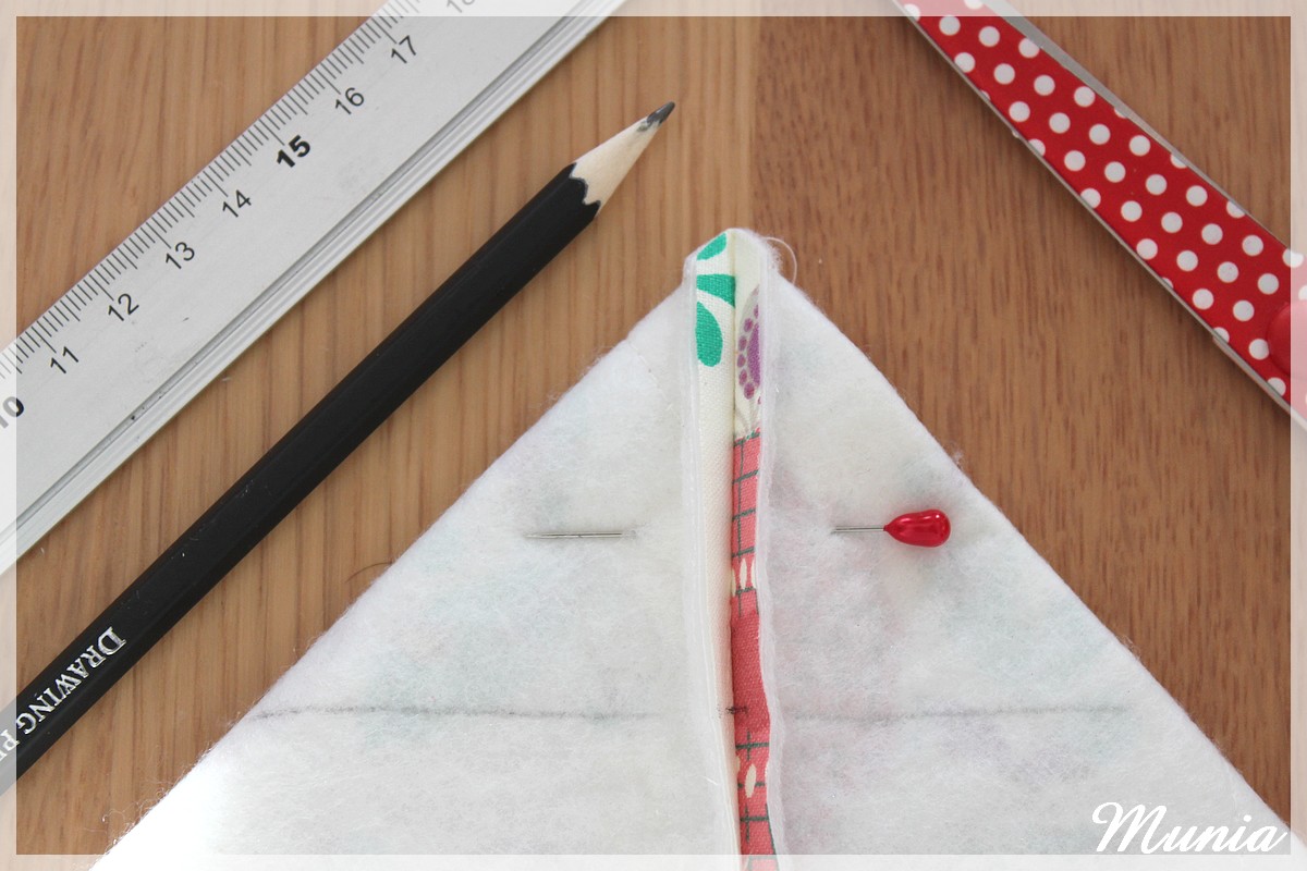 Każdy z czterech rogów rozkładam (warto zwrócić uwagę, żeby szew od naszego rogu pokrywał się z tym wewnątrz ). Odmierzam 6 cm wzdłuż szwu i rysuję prostą linię wszerz :