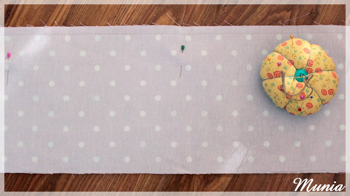 6. Zszywamy dwa materiały wzdłuż ich dłuższej krawędzi. Uwaga! materiały mają być do siebie zwrócone prawą stroną :