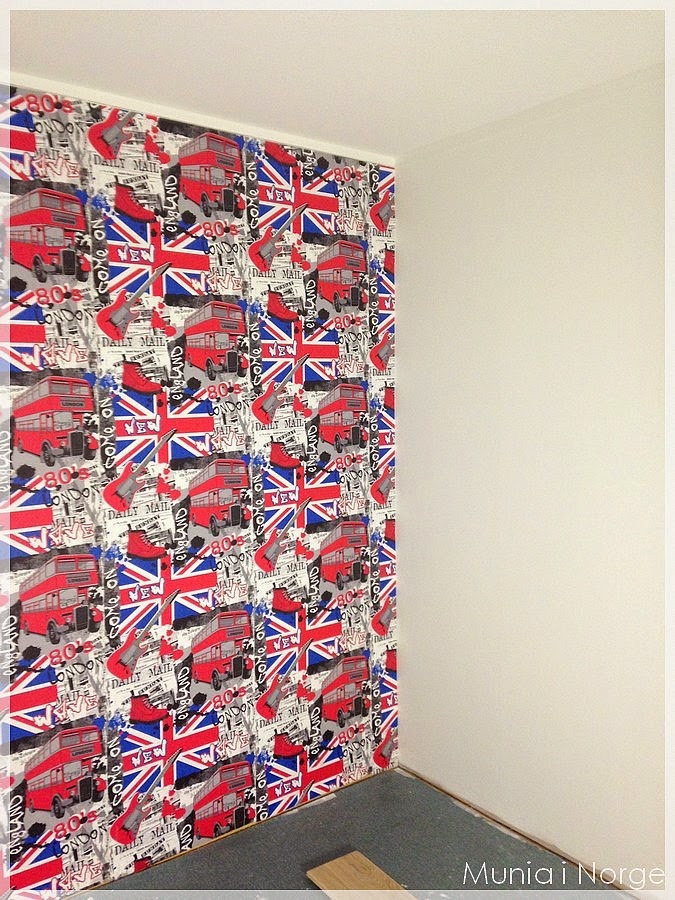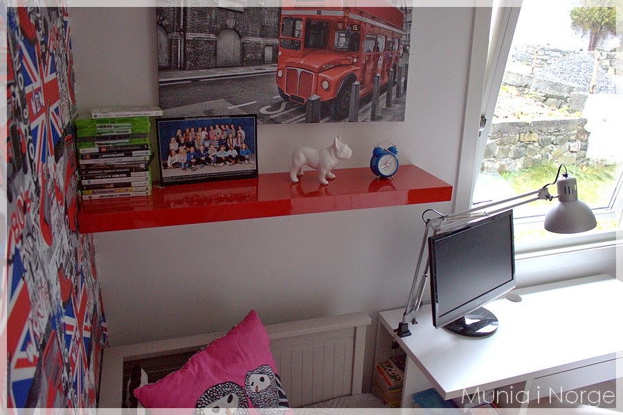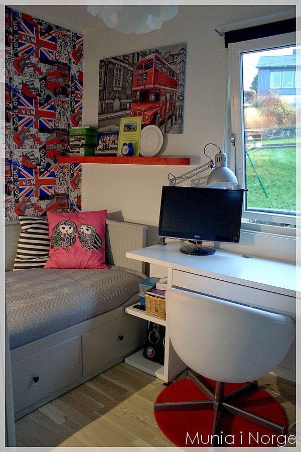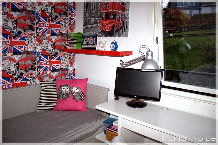 Młoda Pani chciała mieć duży obraz z czerwonym piętrowym autobusem i to mnie zainspirowało do urządzenia jej pokoju. Jedyna tapeta jaką mamy z Polski, to jest właśnie ta u Patrycji w pokoju. Jej jakość niestety trochę nas rozczarowała, ale po wytapetowaniu okazała się całkiem przyjemna dla oka. Tapetę kupiliśmy w Castoramie.